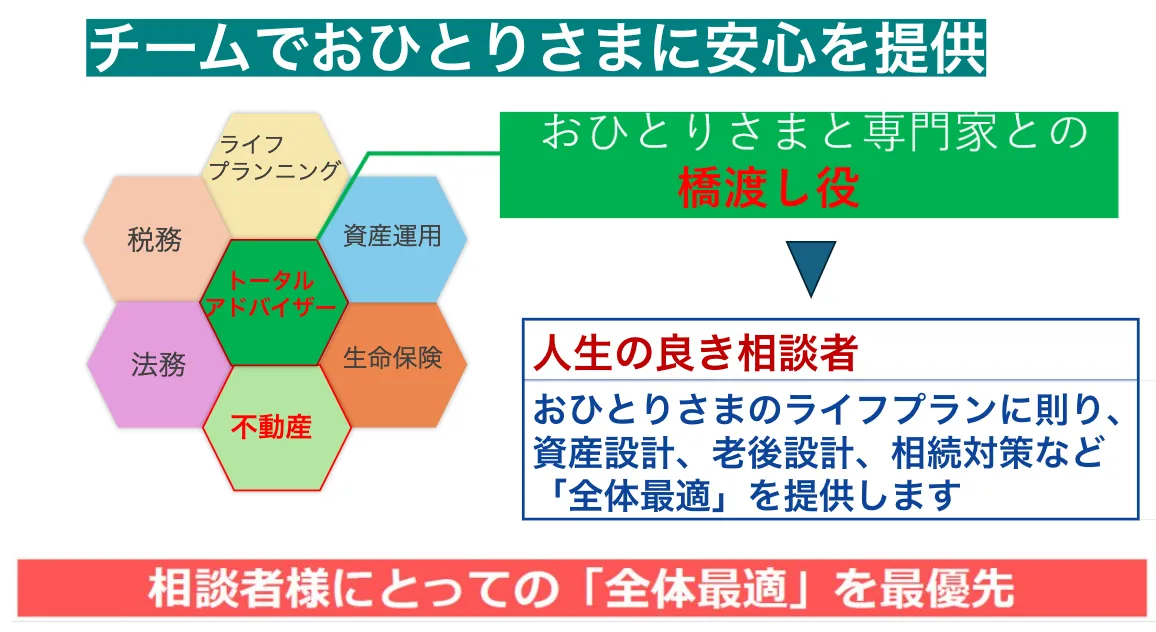 お客様が抱える漠然とした不安の解消を目指し、一人ひとりの背景に深く寄り添う姿勢を大切にしています。建物や土地の管理だけでなく、お客様の日常生活に重点を置いた提案が重要です。誠実な対話を通じて適切な道筋を見つけ出し、納得のいく結論を導き出す支援はもちろん、心安らぐ毎日を過ごすための礎を築くお手伝いをしてまいります。人生のパートナーとして、ともに伴走しませんか。